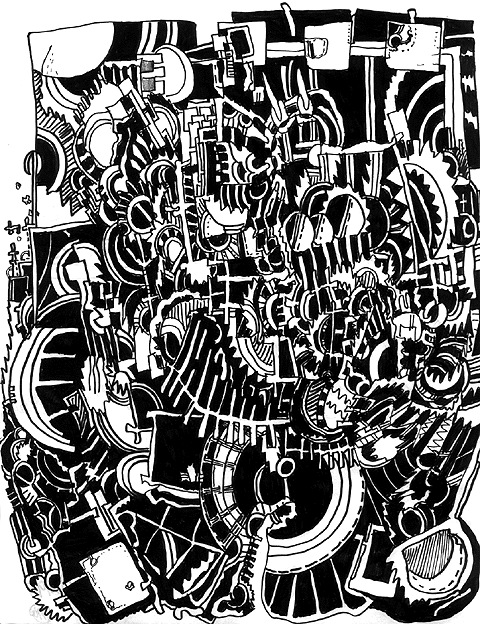 This picture looks like a BIG band playing its loudest. I see a few things that look like instruments such as saxaphones, drums, and a lot of pianos.